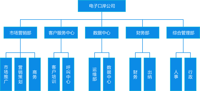 山东电子口岸公司设市场营销部、客户服务中心、数据中心、财务部、综合管理部五个部门,共有员工50余人。